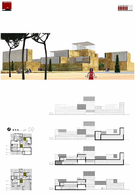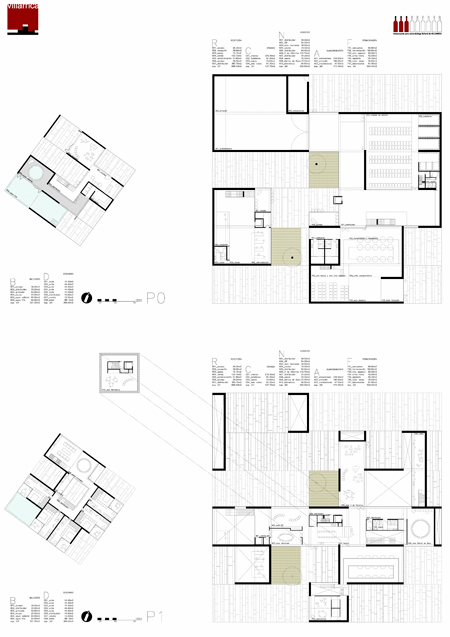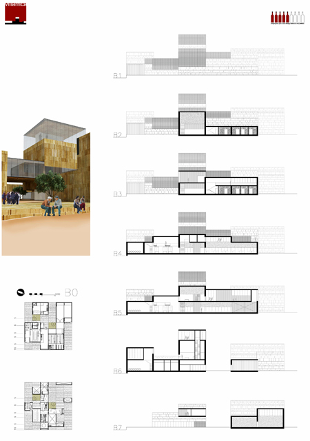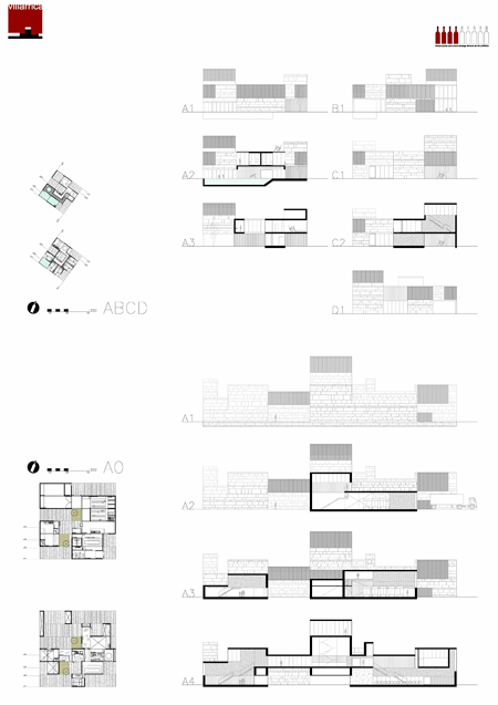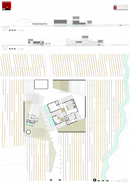 El recorrido social y representativo se organiza en una secuencia de espacios de escala decreciente que comienza en la puerta sur junto a la autopista. La bodega se presenta en escorzo, acentuando su volumetría y su relación con el paisaje, lucernarios, huecos de disparan hacia el horizonte como almenas, y torres de un castillo. La pieza auxiliar propuesta, y la fachada oeste de la bodega definen una plaza representativa de llegada refrescada por una gran lámina de agua y por diversas plantaciones de frutales. No es un lugar de aparcamiento, ni de paso sino un espacio de sosiego y estancia, una oportunidad para el desarrollo de actividades al aire libre. Desde ésta plaza y cruzando la lámina de agua accedemos a la bodega gradualmente, a una de calle entre muros de piedra matizada por dos olivos y un puente. Dos accesos enfrentados definen dos maneras diferentes de recorrer la bodega:_A través del espacio administrativo y de tienda recorriendo el puente en un recorrido en planta primera mas controlado en el que la visita a los espacios productivos y de bodega pueden estar restringidos. _Un acceso en planta baja directamente al espacio productivo. En planta primera se acomoda la mayor parte del programa social y representativo, salas de reuniones cocina, comedores sala de usos múltiples, todos ellos con ventilaciones cruzadas e iluminadas según dos orientaciones que permitirán un control climático más eficiente. Desde esta planta y en relación con el espacio de cocina se accede a la torre de la bodega y del mismo modo es posible la visita al espacio de bodega, de fermentación y de cata. La estacionalidad del proceso productivo pérmite difuminar los límites del programa productivo y social creando ámbitos de usos múltiples y de oportunidad así los espacios de trasiego de planta baja pudieran destinarse a espacio de celebración de acontecimientos sociales de cierta envergadura.