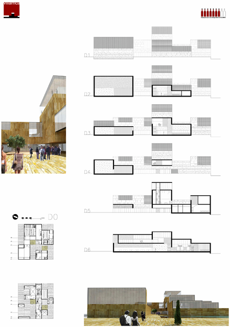 La nueva Bodega entendida como palacio, jardín y villa se convierte en referencia del paisaje que acompaña, en hito, como lo son el campanario de la Asunción en Briones, el castillo de San Asensio o las cumbres de Valdezcaray. El cambio del modelo Nave-polígono al modelo Palacio-villa cambia radicalmente la escala de la intervención y su percepción. De la arquitectura industrial conservamos, sin embargo la precisa geometría de una crujía que se repite que nos remite a la propia organización del proceso productivo a la disposición de las barricas, de las botellas, de los depósitos de fermentación y que revisita una larga tradición de tipología civil y comercial como son las lonjas medievales y renacentistas. La disciplina de la organización funcional en planta que sugiere la lógica productiva tiene su contrapunto en el rol social, cultural y de representatividad que asume hoy una bodega. La multitud de espacios requeridos por el programa se entienden como oportunidad y así cada uno de ellos se ajusta a una escala, a un volumen, a una proporción, a una identidad y encuentran su sitio con naturalidad en la precisa trama que define la crujía en planta. De este modo a cada crujía la define una sección diferente que se corresponde con la diversidad de matices de espacios de lugares y acontecimientos que sugiere un programa complejo. Esta riqueza de escalas y secciones organizada sobre una trama extremadamente precisa configura la imagen de la bodega como villa y palacio como suma de partes, de lugares y de ambiciones.