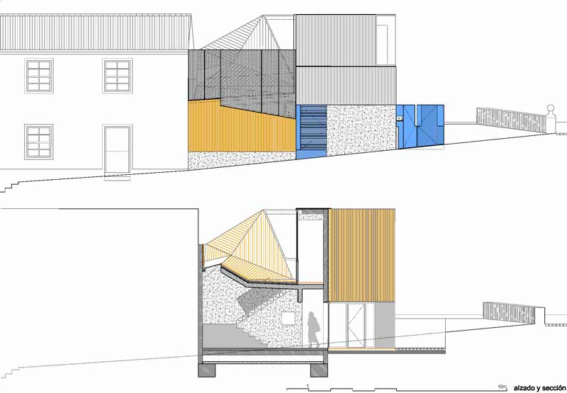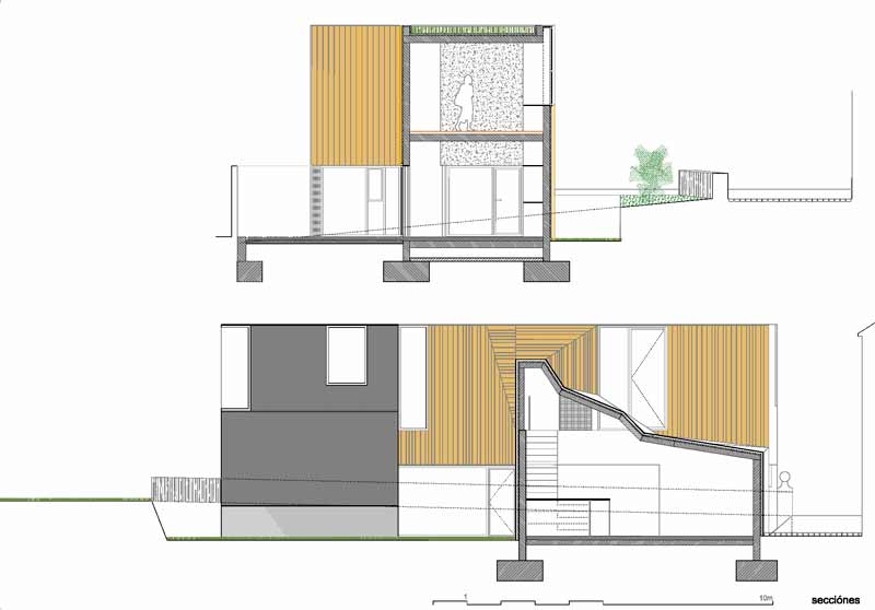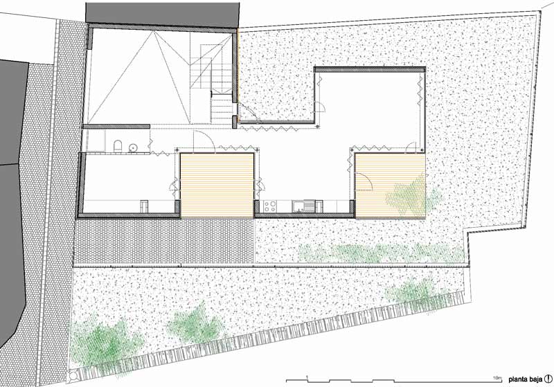 Es una parcela pequeña, difícil, en el núcleo de Perillo, o lo que queda de el, que exprimiéndola al máximo nos permitirá construir unos 174 m2. Se concibe un esquema en planta entorno a 3 patios que intenta maximizar el disfrute de la parcela, como espacio de ocio, apropiándosela. La inserción de la vivienda en la trama urbana esta condicionada además por la necesidad de adosarse en medianera a una pequeña vivienda existente. Esta incomoda situación, se convierte en oportunidad y es en contacto con la edificación adyacente donde la arquitectura, y el espacio adquieren una condición singular que resuelve las exigencias normativas y al mismo tiempo se convierte en acontecimiento y paisaje mineral.