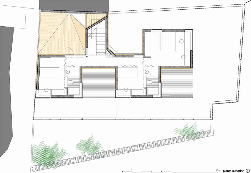 La planta baja se presenta libre y fluida. Los espacios se funden sin imponer usos. No se ha usado ningún tipo de carpintería interior, sino que se ha resuelto la necesidad puntual de privacidad mediante cortinas. El exterior de la parcela difumina su frontera penetrando en la vivienda. La planta superior, conserva esa relación con el entorno, se asoma a las vistas. El espacio de medianera a modo de paisaje alpino domestico se convierte en terraza, solárium, en punto de observación y relación con el barrio.