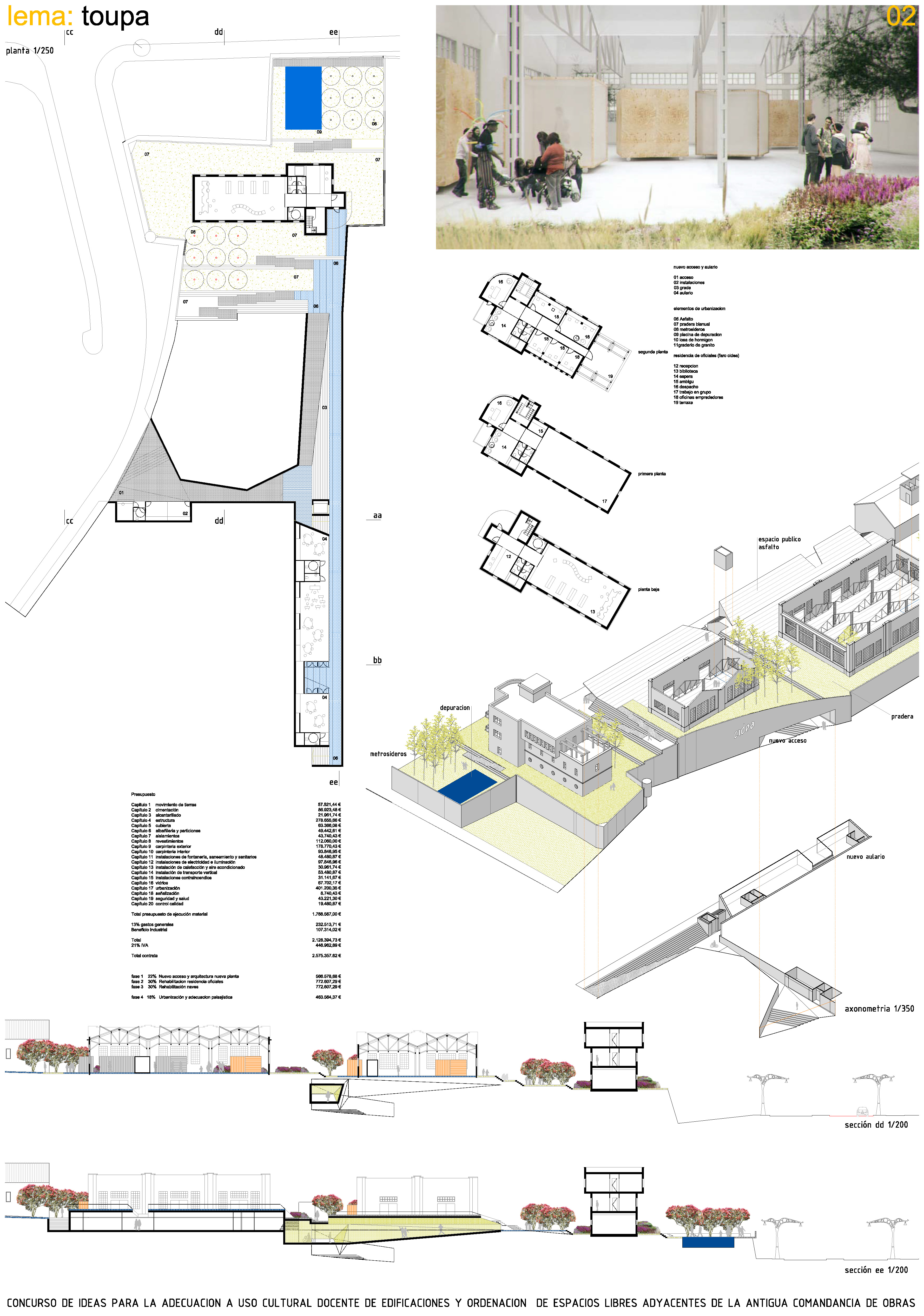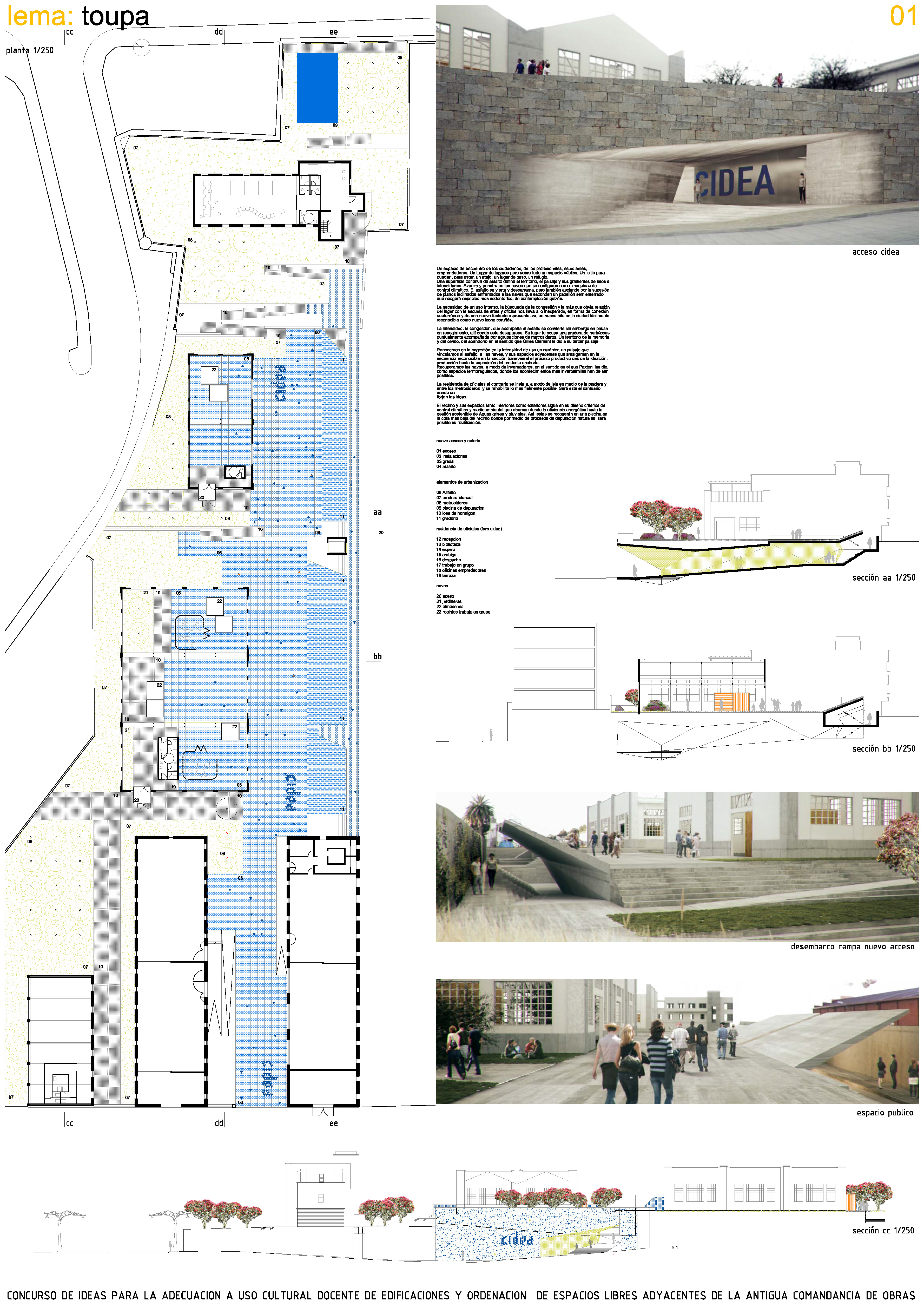Un espacio de encuentro de los ciudadanos, de los profesionales, estudiantes, emprendedores. Un Lugar de lugares pero sobre todo un espacio público. Un sitio para quedar , para estar, un atajo, un lugar de paso, un refugio. Una superficie continua de asfalto define el territorio, el paisaje y sus gradientes de usos e intensidades. Avanza y penetra en las naves que se configuran como maquinas de control climático.El asfalto se vierte y desparrama, pero también asciende por la sucesión de planos inclinados enfrentados a las naves que esconden un pabellón semienterrado que acogerá espacios mas sedentarios, de contemplación quizás. La necesidad de un uso intenso, la búsqueda de la congestión y la más que obvia relación del lugar con la escuela de artes y oficios nos lleva a lo inesperado, en forma de conexión subterránea y de una nueva fachada representativa, un nuevo hito en la ciudad fácilmente reconocible como nuevo icono coruñés. La intensidad, la congestión, que acompaña al asfalto se convierte sin embargo en pausa en recogimiento, allí donde este desaparece. Su lugar lo ocupa una pradera de herbáceas puntualmente acompañada por agrupaciones de metrosideros. Un territorio de la memoria y del olvido, del abandono en el sentido que Gilles Clement le dio a su tercer paisaje.Reconocemos en la cogestión en la intensidad de uso un carácter, un paisaje que vinculamos al asfalto, a las naves, y sus espacios adyacentes que amalgaman en la secuencia reconocible en la sección transversal el proceso productivo des de la ideación, producción hasta la exposición del producto acabado.Recuperamos las naves, a modo de invernaderos, en el sentido en el que Paxton les dio, como espacios termoregulados, donde los acontecimientos mas inverosímiles han de ser posibles.