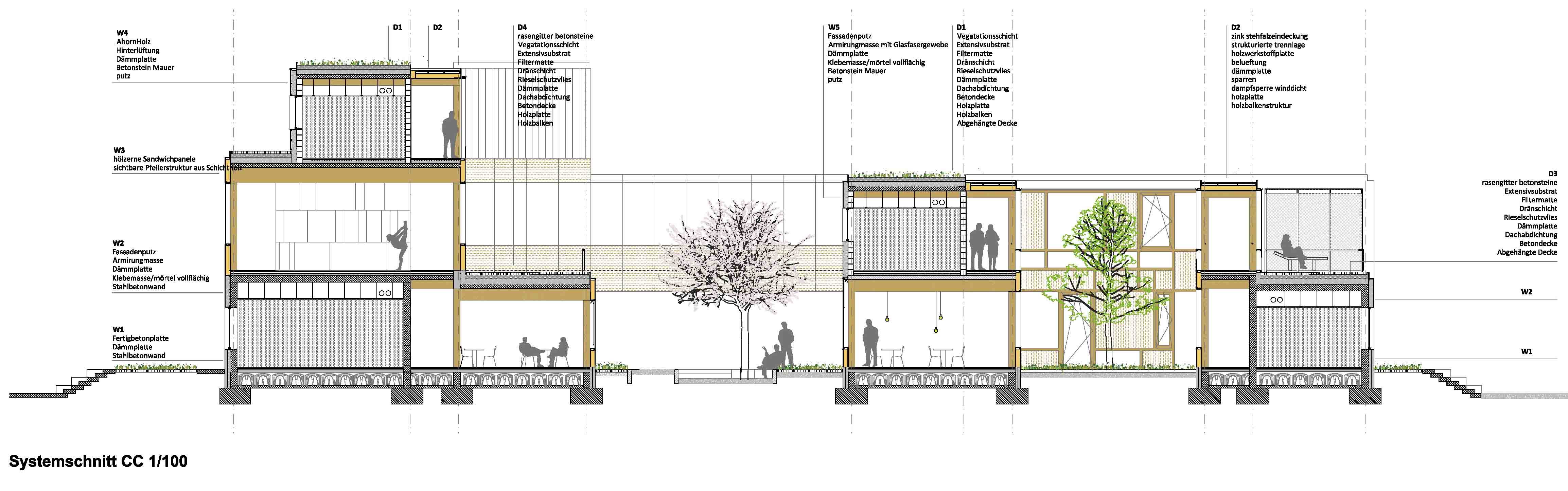 Jede Einheit ist auf 2 Etagen um einen Patio herum angeordnet, jeweils mit einem anderen, speziellen Baum bepflanzt, der sein Markenzeichen sein wird, jedem Patio und damit jeder Hausgemeinschaft also ihre Identität gibt. Innenräumlich bleiben die Hausgemeinschaften eher introvertiert, still, zeigen sich aber gleichzeitig extrovertiert und ausgelassen im Bereich der Wohnstuben, die die grüne „Straße“ und den Patio verbinden oder auf den Terrassen des zweiten Geschosses, die sich in die alpine Landschaft öffnen.