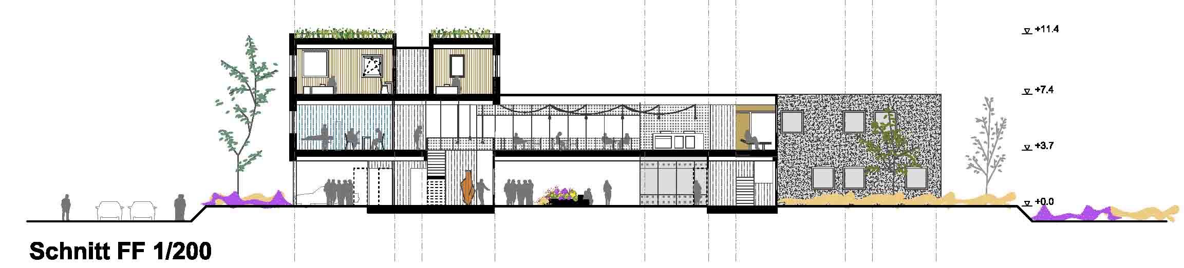 Am östlichen Ende des Dienstleistungsgebäudes, also in direkter Anbindung an das Straßennetz des Dorfes, ist der Haupteingang angeordnet, mit ihm verbunden sind im Erdgeschoss die Arztpraxis, die Tagesbetreuung und im Obergeschoss die öffentlichen Funktionen (Café, etc.), der Sozial- und Gesundheitssprengel» und die Verwaltung. Durch die Aufteilung des öffentlichen Bereichs in zwei Geschosse erhält das Gebäude auch einen Teil ebenjener bereits angesprochenen urbanen Komplexität zurück, die durch die ursprüngliche Reduzierung der Stadt auf eine einzige Straße zuvor eingebüßt wird. Im dritten Stockwerk findet sich das Betreute Wohnen, gleichsam einem eigenen kleinen Dorf, abermals mit eigener Identität. Das Westend konfiguriert den Block der Lagerdienste und ebender Einrichtungen, die im Erdgeschoss mit diesen verbunden sind. Dazu zählen verschiedene Lager, die Küche und im Obergeschoss die Wäscherei und die Personalräume.