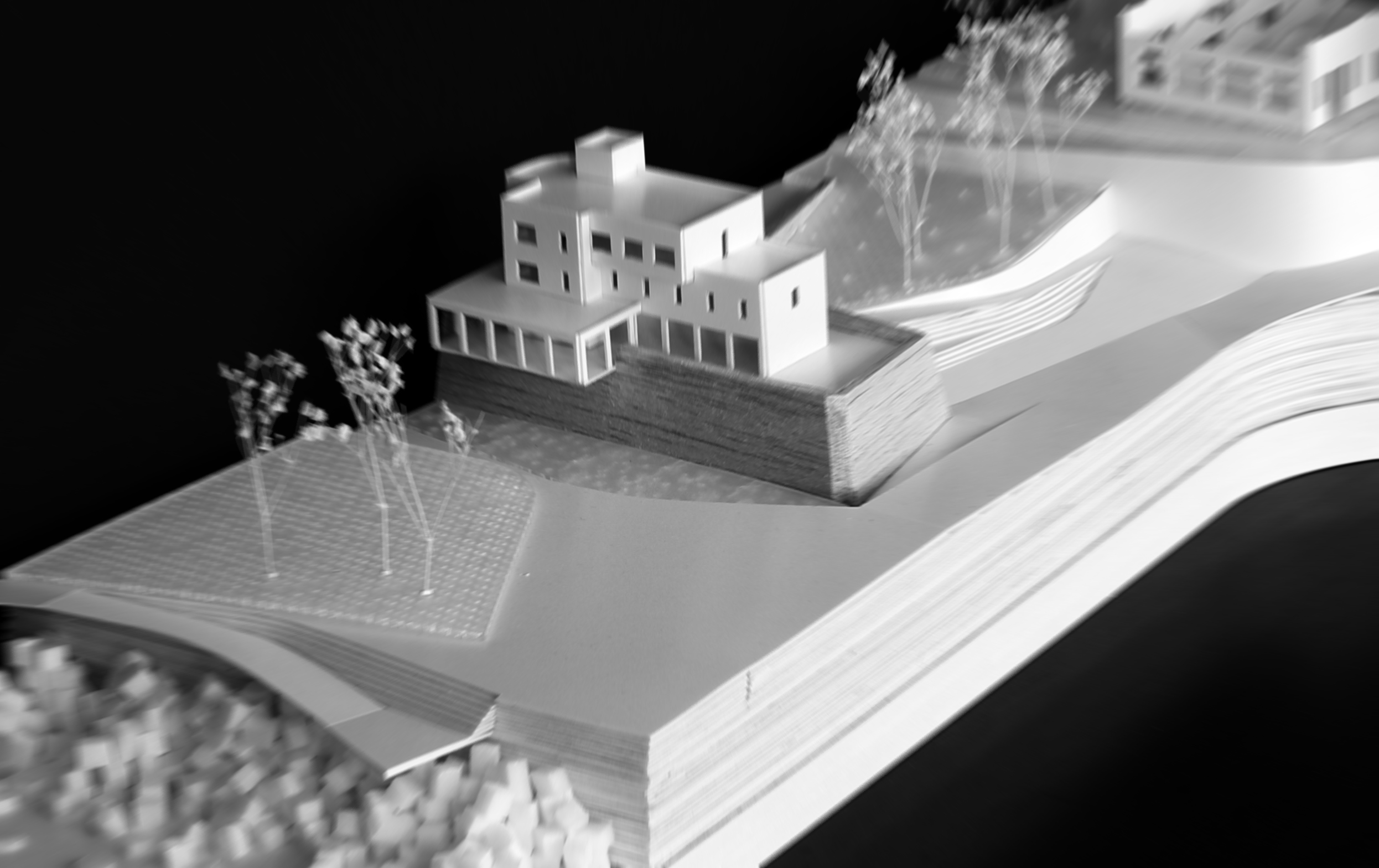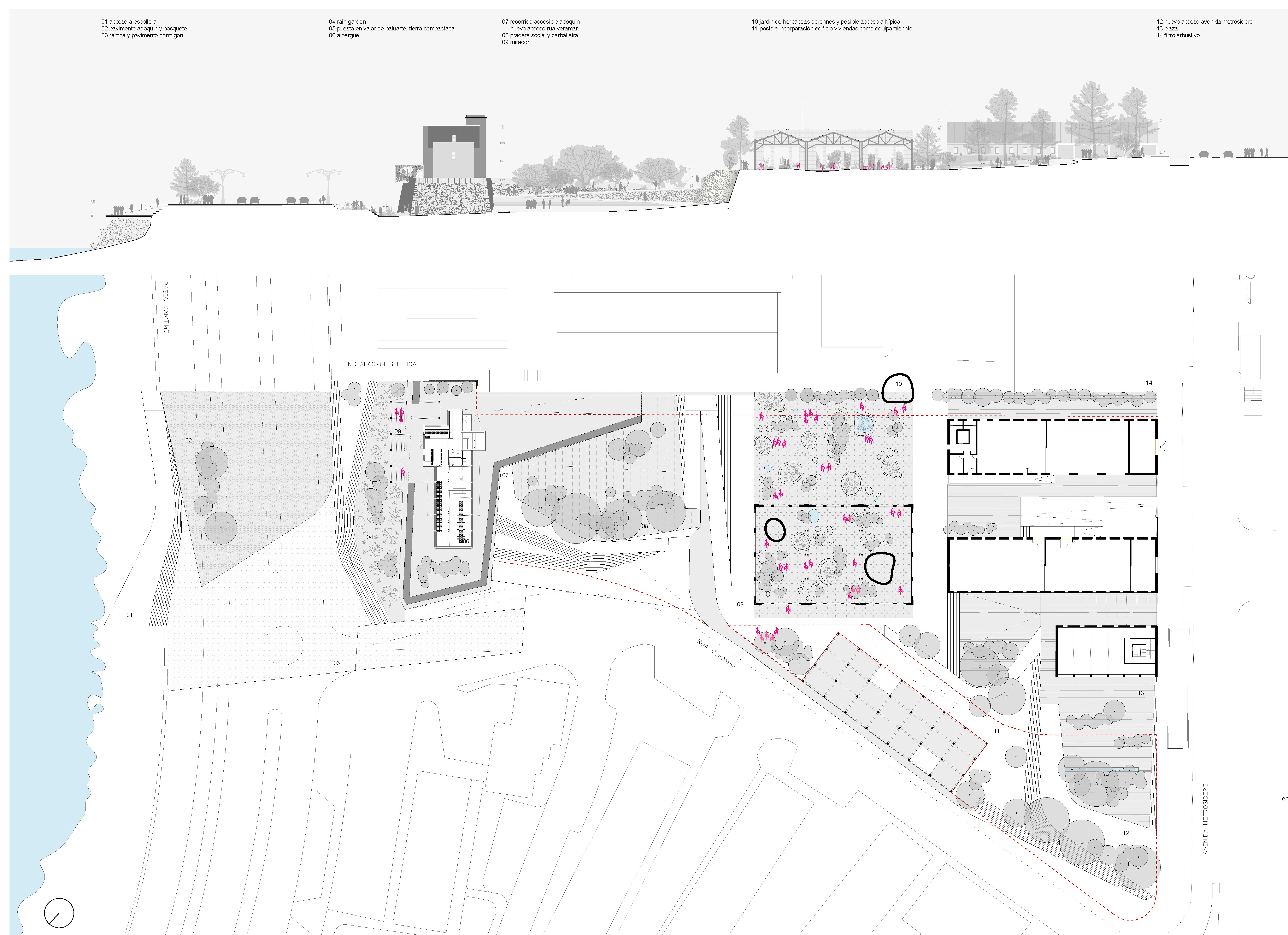 02_Recuperamos una de las sugerencias de la “Revisión e adaptación do plan especial de protección e reforma interior da pescadería e cidade vella 2015 “ en cuyos planos de ordenación “Intervención no espacio público” se dibuja un acceso en rampa desde la rua Veramar a la cota superior del relleno donde se sitúan las naves del metrosidero ya recuperadas y la que aún está disponible. Entre el lienzo del “Baluarte de Roma” y la nave a recuperar desmontamos el relleno de los años 50 recuperando la percepción completa de la fortificación del XVIII al mismo tiempo que se configura un recorrido accesible. La identidad de este lugar recupera la relación del baluarte con las trincheras que completaban el sistema defensivo en relación con una naturaleza y una topografía aun escasamente transformadas. Se interpreta aquí una vocación del lugar en la sucesión de muros de contención que acompañan el ascenso lento y en la definición de lo que llamamos “Pradera Social”. Un pequeño bosque Atlántico, una Carballeira, acompañada de algún frutal como nota de color que ha de acoger la celebración, el ocio, el encuentro con el otro, las miradas cruzadas entre los árboles. Desde La pradera se continua el ascenso por un lado a la cota de las naves y por potro al baluarte y el edificio racionalista que se sitúa sobre el finalizando el recorrido en un pequeño mirador cubierto posado sobre el lienzo histórico que nos recuerda a aquel del cercano Jardín de San Carlos. La materialización de esta fase ha de incidir en el contraste entre el baluarte como elemento patrimonial y las intervenciones posteriores La conexión peatonal en este punto es estratégica pues no solo facilita la movilidad hacia la ciudad desde la cota del Paseo Marítimo, sino que esperamos active la rua Veramar y su relación con la escuela Pablo Picasso.